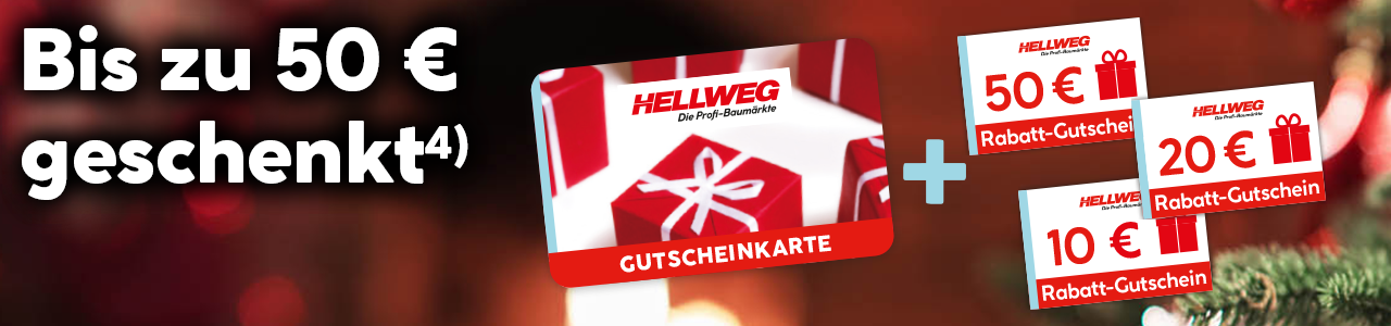 Die Gutscheinkarte von HELLWEG ist die perfekte Geschenkidee! Das Beste daran: Beim Kauf einer Gutscheinkarte erhalten Sie, als Geschenk für sich selbst, einen Rabatt-Gutschein GRATIS⁴⁾ dazu!